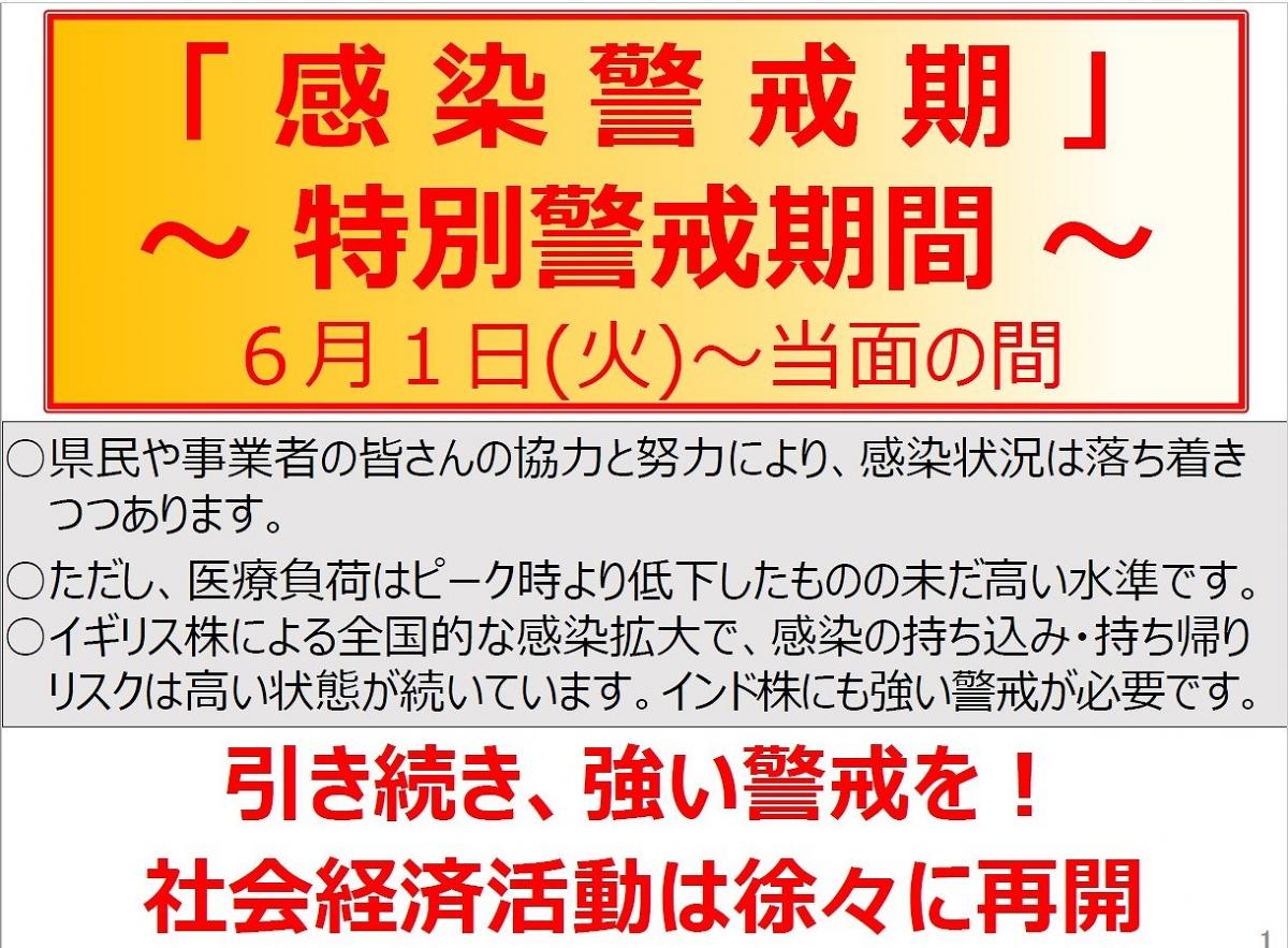 「 感染対策期 」 から 「 感染警戒期 ~特別警戒期間~ 」 に移行しましたが、引き続き感染対策にご留意ください。
