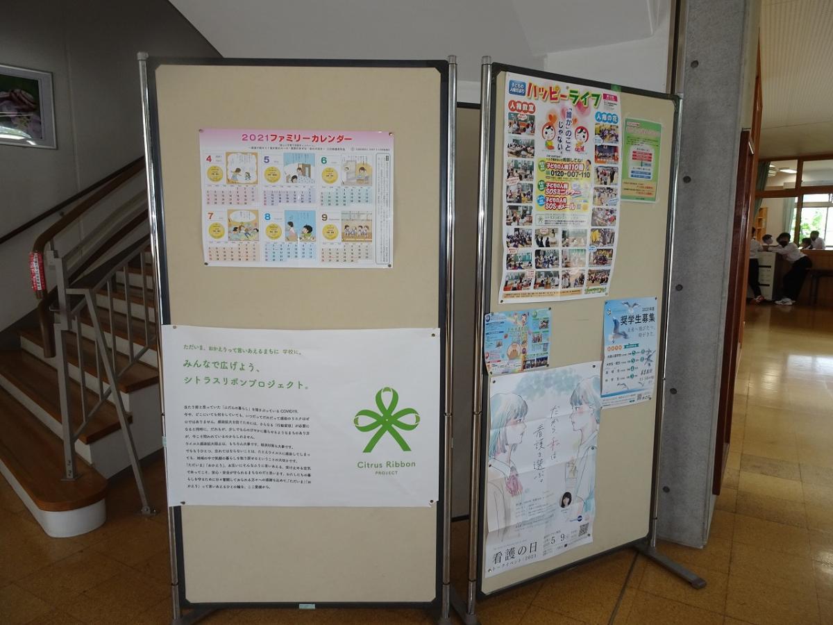 生徒玄関には、生徒に見てもらいたい啓発資料や知ってほしい情報などが掲示してあります。