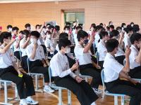 今朝、全校集会で体育委員会から体育大会についての説明があり、続けてブロック決め、結団式が行われました。