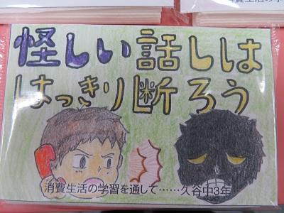 卒業した3年生が、家庭科での消費生活に関する学習を基に、地域の方々に啓発メッセージを作りました。このメッセージはポケットティッシュに入れて配布しています。松山市からいただいた「笑顔あふれる学校づくり」の補助金を活用して制作しました。ティッシュは坂本公民館と荏原公民館を通して地域の方々へ配布していただいています。