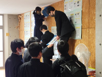 【廊下でジャンケンをする生徒・掲示を手伝う生徒】