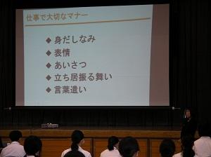 2020年9月11日 16時30分2年生の総合的な学習の時間で、マナー講座を実施しました。今回の目的は、「職業人・社会人としての生き方を学び、将来の生活への視野を拡大することにより、自分の生き方を考え、自己実現への意欲を高める。」です。キャリアコンサルタントのゲスト講師の方に、社会人としてのマナーだけでなく、2年生がこれから進路について考えるに当たって大切なことを教えていただきました。ありがとうございました。