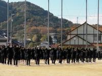 2019年12月9日 16時15分久谷中学校創立60周年記念行事として、ドローンによる学校と人文字でつくった校章の空中撮影を行いました。運動場に1辺38mの巨大な正三角形を作図し、その正三角形を基本にして校章を描きました。生徒の皆さんにその校章の上に立っていただき、リハーサルを重ね、久谷中生による巨大な校章が運動場に出現しました。そして、いよいよ撮影当日である今日を迎えました。